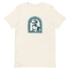 A vintage-style portrait of your favorite pup, framed in a arched window rendered in dusty teal on vintage white. The kind of illustration that feels like it belongs on the wall of a well-traveled apartment — graphic enough to be interesting, understated enough to wear anywhere.