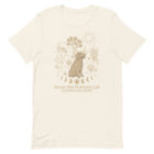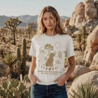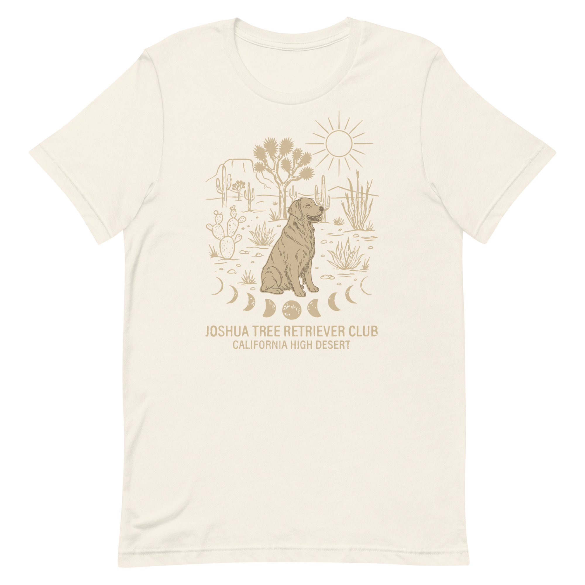 This one’s for the desert dogs and the people who follow them anywhere. Rendered in warm gold on vintage white, the illustration captures a Golden Retriever mid-contemplation — surrounded by Joshua trees, saguaro, prickly pear, and the full cycle of the moon beneath his paws. Equal parts campfire and California mysticism.